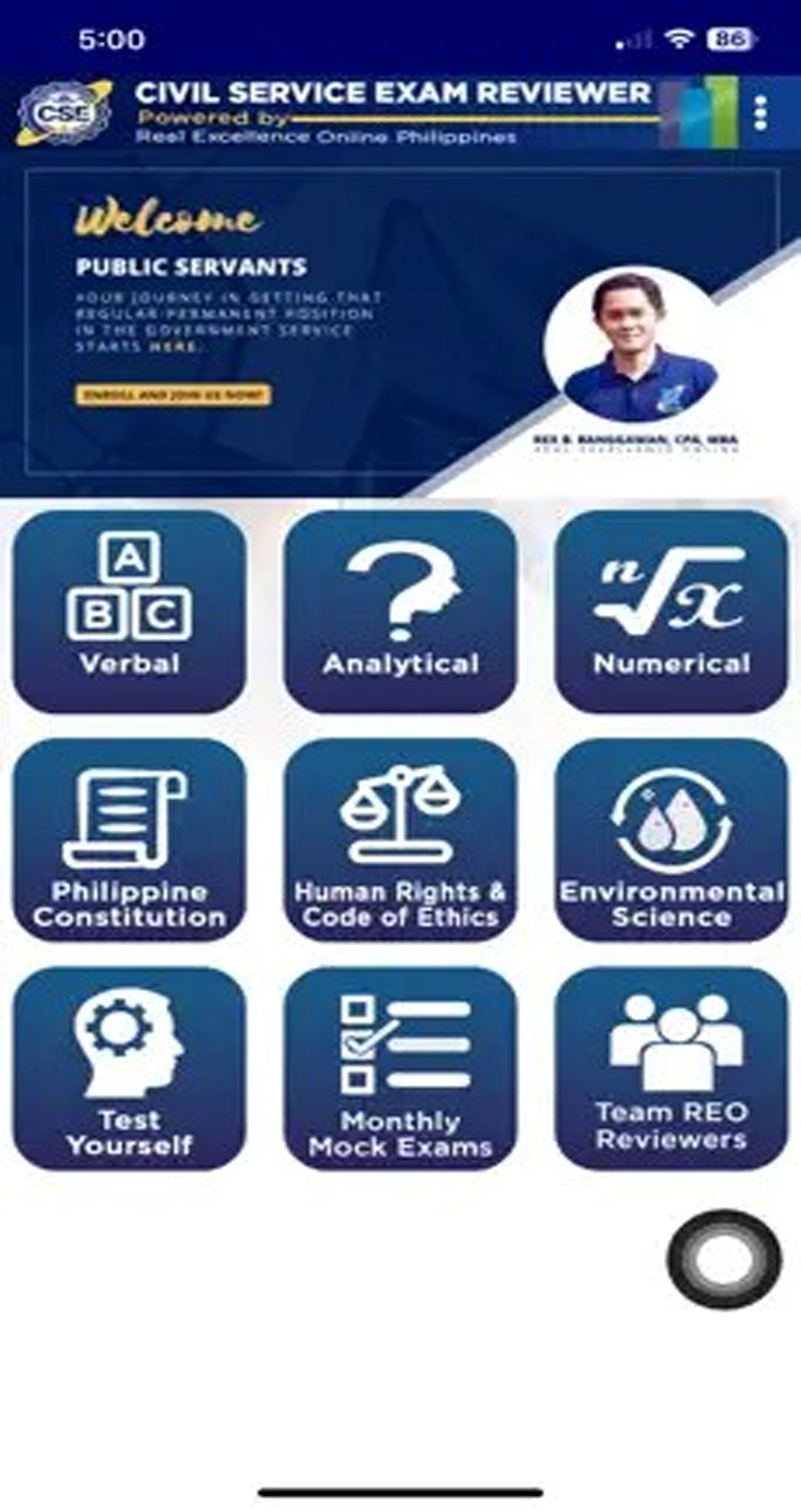 This reviewer app utilizes a learning management system to help the user tackle all the subjects of the Philippine Civil Service Exam. The primary objective of the app is to provide up-to-date, accurate, and comprehensive information needed to pass. This will equip the user with the required competencies for a lifelong career as a civil servant.