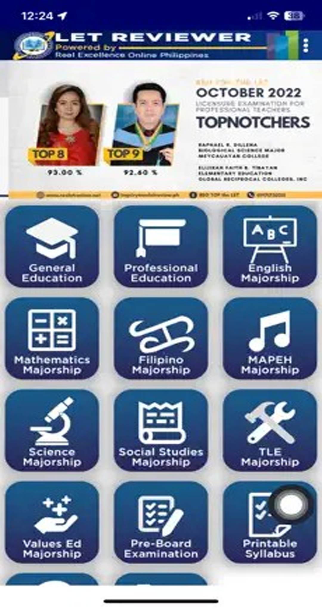 This premium reviewer app utilizes a learning management system to help the user tackle all the subjects of the Licensure Examination for Professional Teachers (LEPT). The primary objective of the app is to provide up-to-date, accurate and comprehensive information needed to pass or even top the LEPT as well as to enhance the content, technological and pedagogical proficiency of the user. This will equip the user the required competencies for a lifelong career as a professional teacher. Moreover, it also caters to the needs of students enrolled in the undergrad taking education courses.