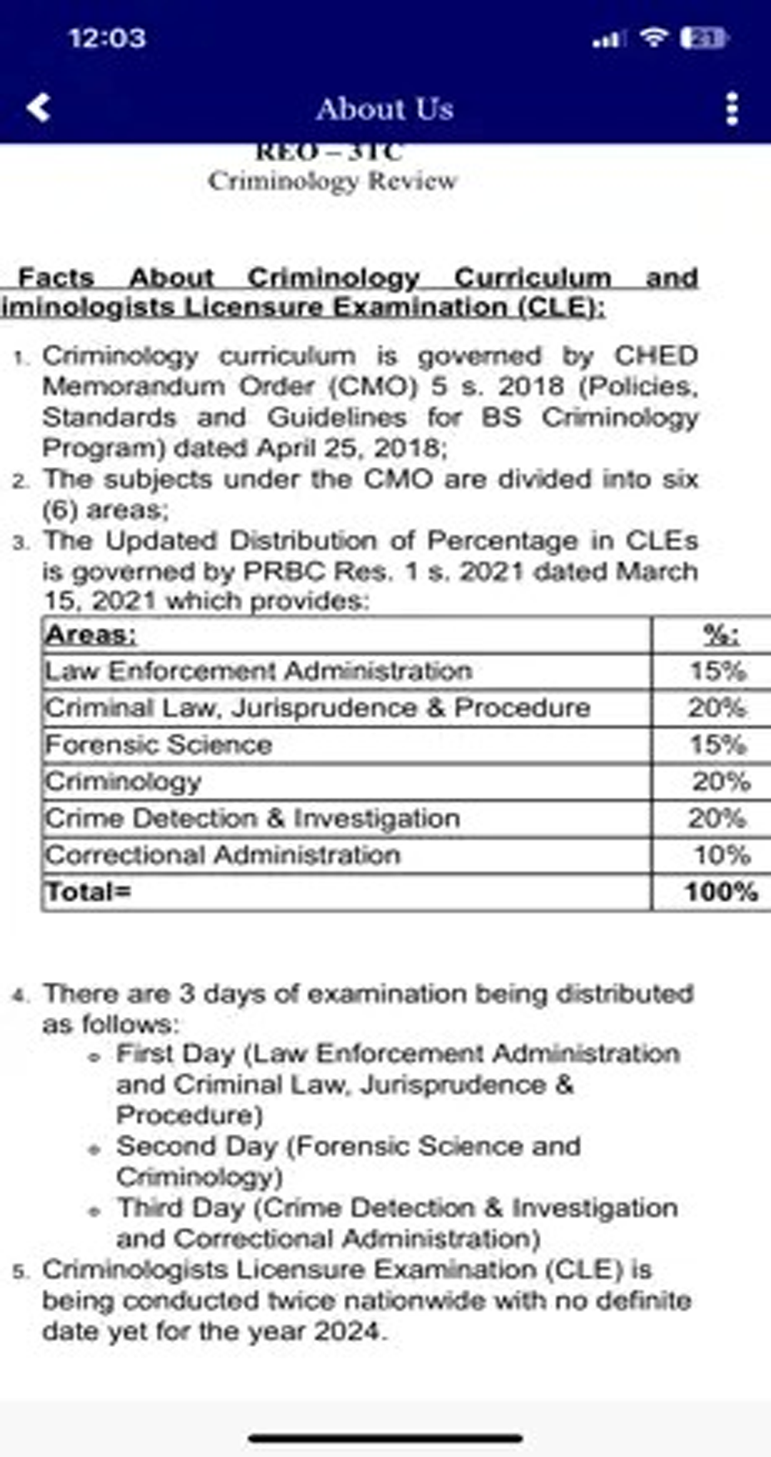 This reviewer app utilizes a learning management system to help the user tackle all the subjects of the Criminologist Licensure Exam. The primary objective of the app is to provide up-to-date, accurate, and comprehensive information needed to pass or even top the CLE as well as to enhance the content, technological and pedagogical proficiency of the user. This will equip the user with the required competencies for a lifelong career as a professional criminologist. Moreover, it also caters to the needs of students enrolled in the undergrad taking criminology course.