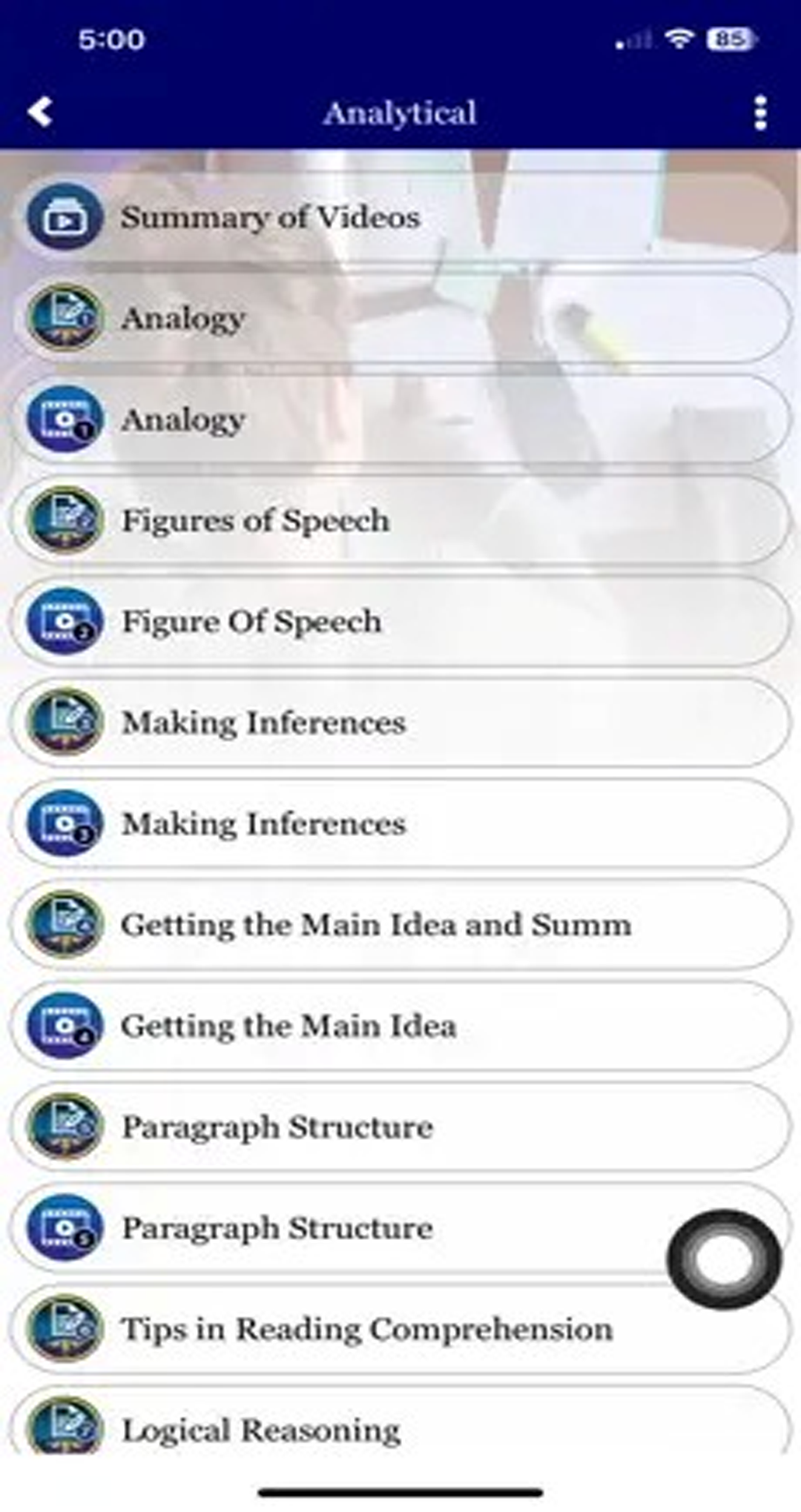 It is a comprehensive reviewer that covers all the competencies of the Civil Service Exam as indicated in its table of specifications. It includes lecture notes intended to orient the user on the basic concepts of each topic. The app offers video lectures to augment the lecture notes for an in-depth discussion of the more complex and complicated topics of the subject. Sample problems are presented during the lectures to teach the user the application of the concepts and theories. The user can access the app and learn on his/her own pacing in a stress-free environment.