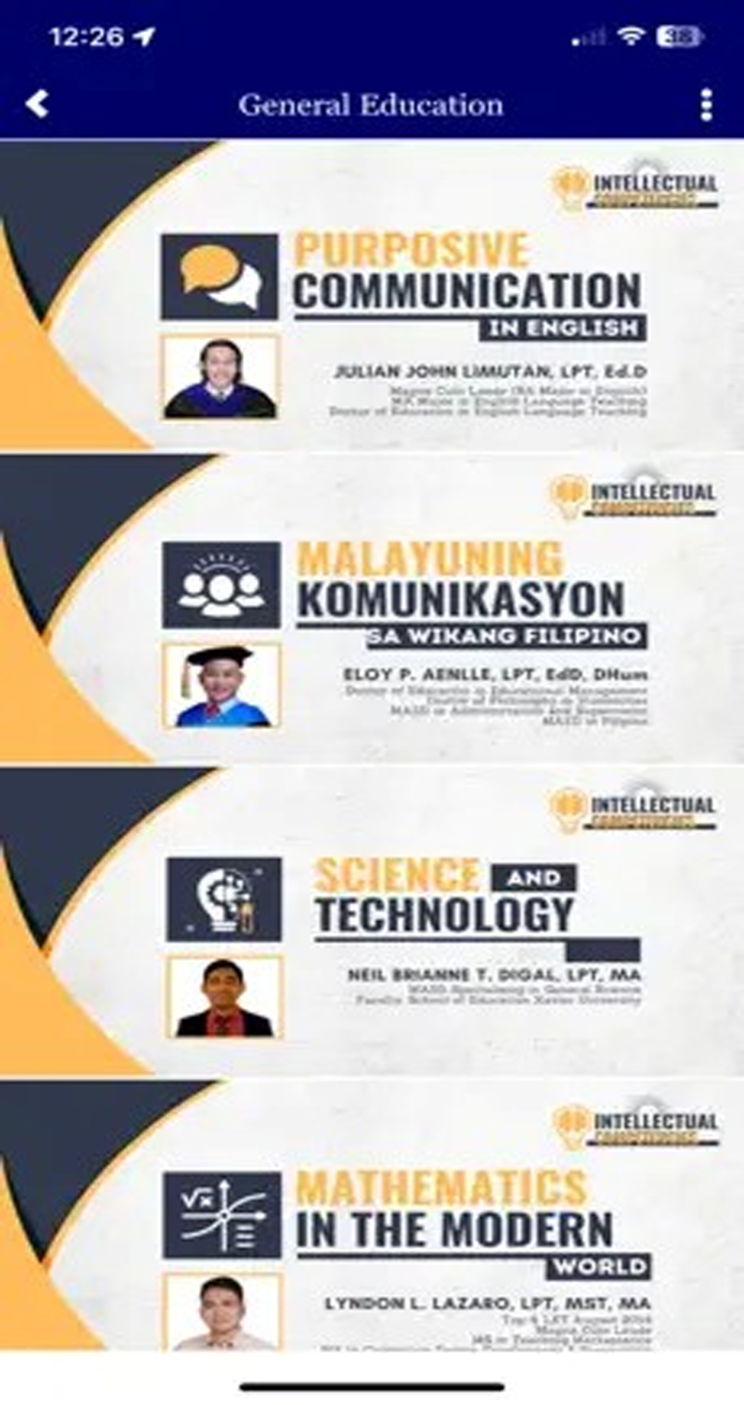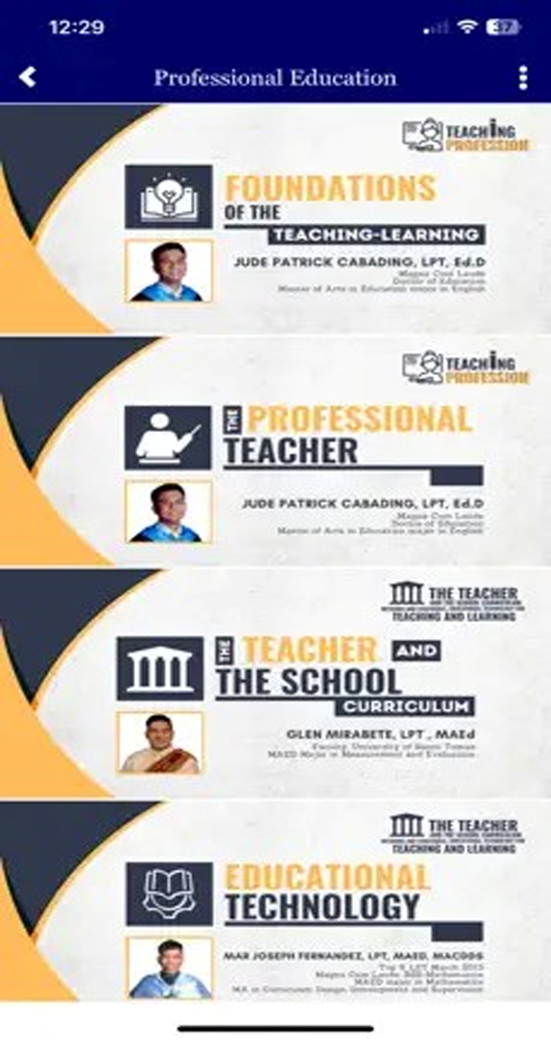 It is a comprehensive reviewer that covers all the competencies of the LEPT as indicated in its table of specification. It includes lecture notes intended to orient the user on the basic concepts of each topic. The app offers video lectures to augment the lecture notes for an in-depth discussion of the more complex and complicated topics of the subject. Sample problems are presented during the lectures to teach the user the application of the concepts and theories. The user can access the app and learn on his/her own pacing on a stress-free environment.